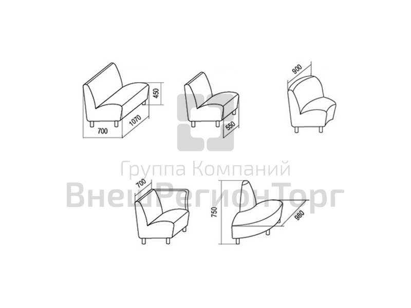 - Двухместную секцию без подлокотников 1070 х 700 х 750h мм., 0.62 м3 – 1 шт.;