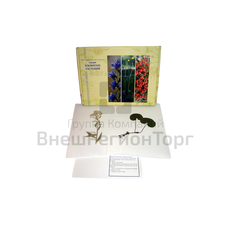 В гербарии представлены 20 наименований наиболее распространенных и известных растений, которые являются ядовитыми и в то же время имеют лекарственное значение. Список растений прилагается. Каждое засушенное растение наклеено на гербарный лист (формат А3), на котором обозначено наименование растения и дано краткое описание. Изделие упаковано в коробку с маркировкой.