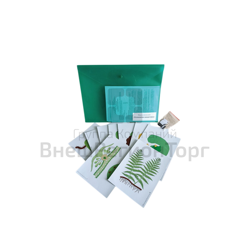 Пособие состоит из 9 карточек, напечатанных на картоне и ламинированных матовой (антибликовой) пленкой. На карточках изображены стадии цикла размножения и развития папоротника. Пособие снабжено магнитным креплением, что позволяет монтировать схемы на магнитной доске. Перед началом работы с пособием на карточки нужно наклеить магнитную резину, предварительно сняв с неё защитную плёнку. Модель-аппликация упакована в папку-конверт на кнопке.