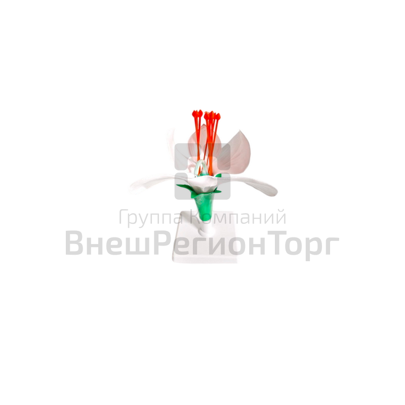 Модель изготовлена из пластмассы, раскрашена в цвета приближенные к естественным и представляет собой увеличенный цветок гороха. На модели можно рассмотреть: цветоложе, сросшиеся чашелистики, лепестки венчика, тычинки, столбик пестика. Изделие упаковано в коробку с маркировкой.