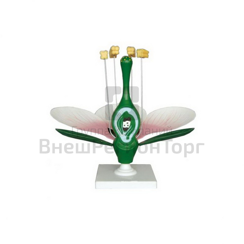 Модель цветная, изготовлена из пластмассы, представляет собой увеличенный цветок яблони в разрезе. Модель разборная: чашелистики (4шт.), лепестки (3шт.), тычинки с целыми пыльниками (2шт.) и тычинки с поперечно разрезанными пыльниками (2 шт.), вставляются в пазы на цветоложе модели цветка. Модель позволяет рассмотреть особенности внешнего и внутреннего строения цветка яблони, а также внутреннее строение завязи пестика. На модели можно рассмотреть следующие детали строения: цветоложе, чашелистики, лепестки венчика, тычинки (тычиночные нити и пыльники), пестик (рыльце, столбик, завязь), пыльцевая трубка, семяпочка, семязачаток, яйцеклетка, центральная клетка.