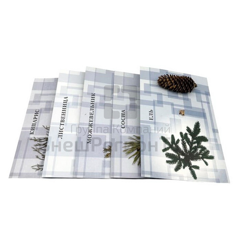 В коллекции представлены 5 видов голосеменных растений (сосна обыкновенная, кипарис, лиственница, ель, можжевельник) в виде натуральных объектов – ветки (кроме ветки ели), семена (кроме семян можжевельника), шишки, наклеенных на планшеты, с обратной стороны планшетов есть картинки и пояснительный текст к данному растению. Наиболее целесообразно использовать коллекцию в качестве раздаточного материала, предложив учащимся следующие задания: рассмотрите внешнее строение побегов; рассмотрите строение шишек; рассмотрите семена; в чем различие и сходство побегов, шишек, семян; как распространяются семена этих растений; как семена расположены в шишках. Коллекция может быть использована в курсе природоведения и географии при изучении различных природных зон.