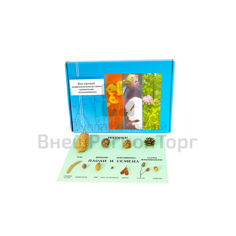 Коллекция представлена цветным, заламинированном планшетом из плотного картона формата А4 и наклеенными на него объектами: шишки голосеменных растений - 4 вида, плоды и семена деревьев и кустарников - 7 видов. Представлены натуральные образцы шишек, плодов и семян наиболее распространенных деревьев и кустарников, что позволяет продемонстрировать особенности строения шишек, семян и плодов, их сходства и различия. Планшет упаковывается в коробку с маркировкой.