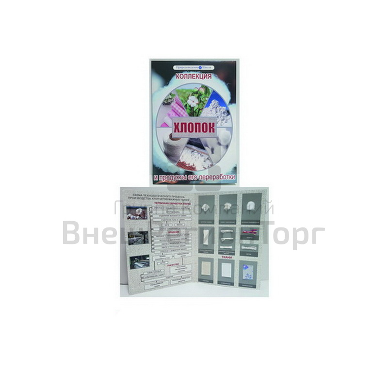 В коллекции представлена технологическая схема производства хлопчатобумажных тканей от сырья до получения готовых изделий и даны основные продукты каждой стадии технологического процесса. На папке расположены рисунки ветки хлопчатника с цветами и плодами и коробочки с волокнами. Коллекцию можно использовать для оформления кабинетов, а также для проведения контрольных опросов и самостоятельных работ. Коллекция в виде папки (в сложенном виде размер 400x280x10мм) упакована в термоусадочную плёнку. На папке печатным способом нанесено: - наименование коллекции; - наименование предприятия- изготовителя и его адрес.