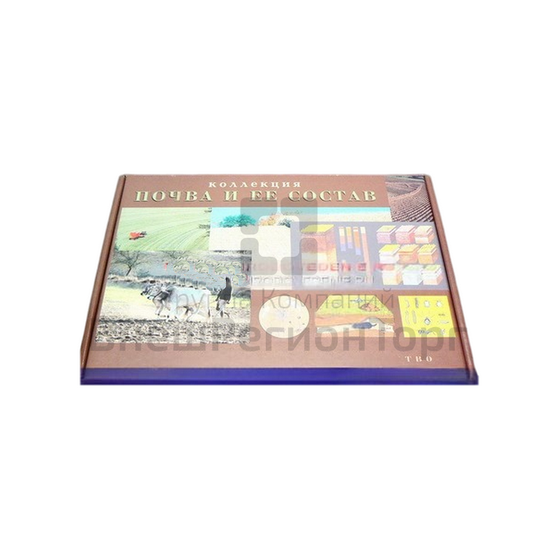 В коллекции представлены образцы почв: чернозёмная, подзолистая, болотная торфяная, песок, глина, перегной. Образцы почв помещены в пластмассовые контейнеры с крышкой и снабжены этикетками согласно списку. Изделие упаковано в коробку с маркировкой, которая покрыта термоусадочной плёнкой.
