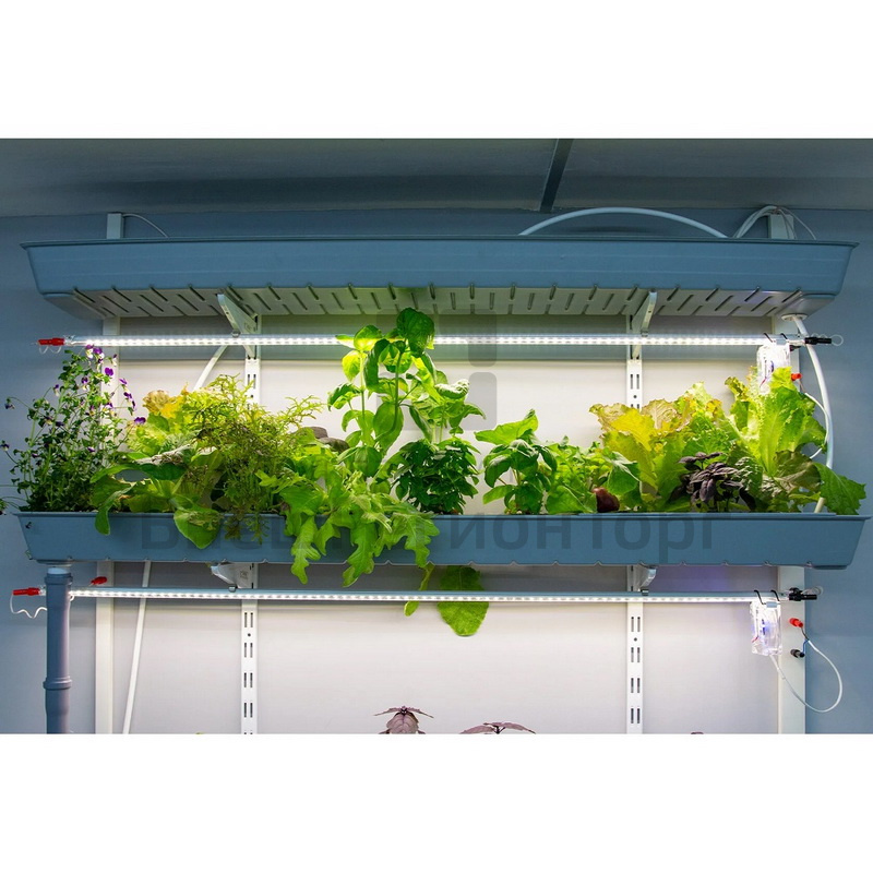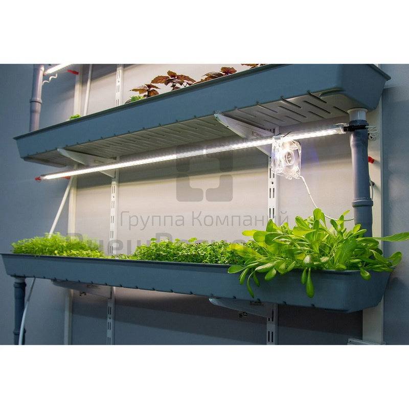 - 3 энергоэффективных фито-светильника длиной 117 см (156 полно спектральных светодиодов и 30 с длиной волны 625 Нм–красный цвет) 25 Вт, 12 В. Система лёгкого, без использования инструментов, изменения количества, высоты подвеса и направления светового потока на каждом этаже