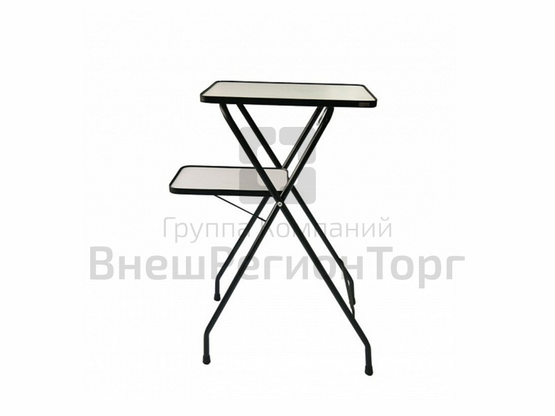 Две полки, расположенные на разной высоте, позволяют одновременно устанавливать на нем проектор и ноутбук, а также размещать различные аксессуары для презентаций. Наличие двух пар ножек придают изделию дополнительную устойчивость и обеспечивают сохранность расположенного на нем оборудования. Столик отличается лаконичным дизайном и выполнен в черно-серой гамме. На стальную раму нанесено черное порошковое покрытие, придающее дополнительную защиту от ржавчины и царапин; полки окрашены в светло-серый цвет