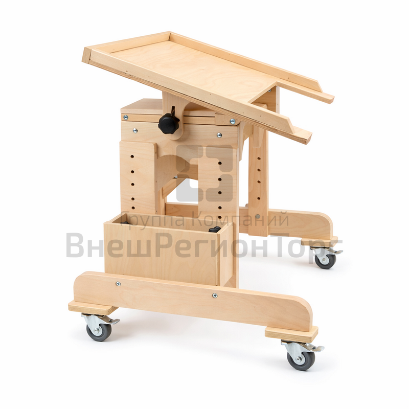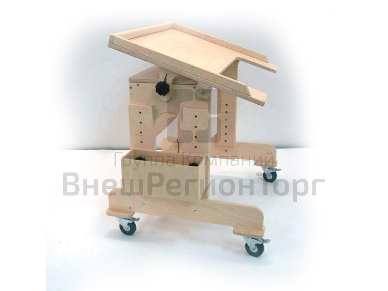 Для удобства перемещения столик снабжен колесиками со стояночными тормозами. К любой из сторон столика можно прикрепить ящик для личных принадлежностей ребенка. Изделие выполнено из высококачественной березовой фанеры.