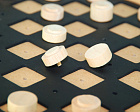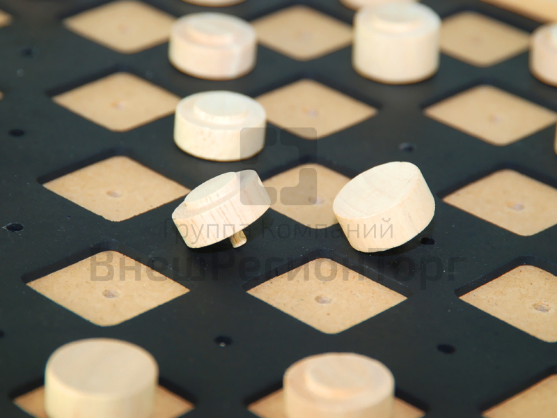- во-вторых, 2 вида фигур (черные и белые) тактильно различимы между собой – один вид имеет круглую выпуклую шапочку, другие — с гладкой поверхностью. Шашка-дамка отличается от шашки высотой фигуры. Благодаря этому существенно упрощается процесс игры для людей с нарушенным зрением.