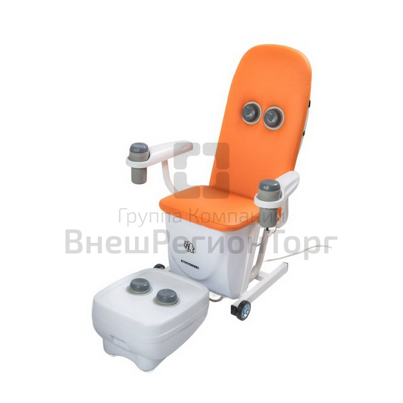 Кресло массажное: на металлическом каркасе; спинка, сиденье и подлокотники мягкие, кожаные. В подлокотниках установлены 2 модуля для массажа кистей рук.