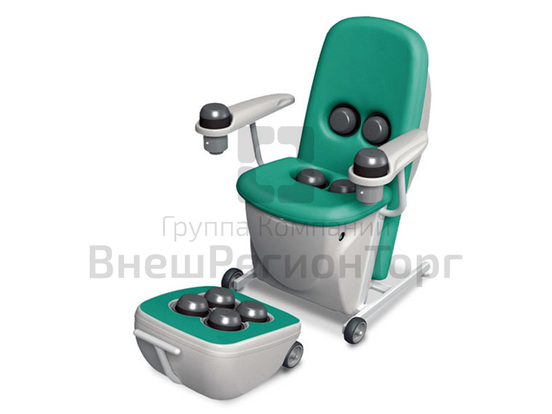 - Кресло массажное: на металлическом каркасе; спинка, сиденье и подлокотники мягкие, кожаные. В подлокотниках установлены два модуля для массажа кистей рук. В сиденье встроены 2 массажных модуля. В спинке кресла установлен передвижной блок с двумя модулями, которые перемещаются по вертикали за счет электропривода и фиксируются на разных участках спины.