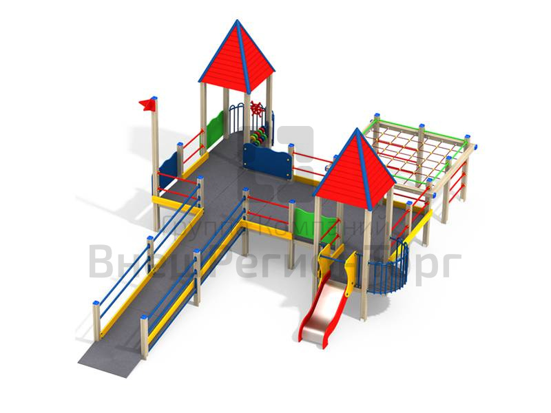 Детский игровой комплекс Маленькая страна предназначен для совместных игр здоровых детей и детей с ограниченными возможностями здоровья. Он состоит из двух башен-площадок с пирамидальными крышами и балконами. Высокотехнологичный детский комплекс выполнен из безопасных и прочных материалов.