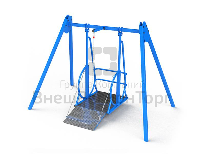 Качели имеют специальный пандус, по которому можно заехать на платформу. А также предусмотрен специальный механизм, держась за который, ребенок самостоятельно себя качает.
