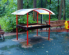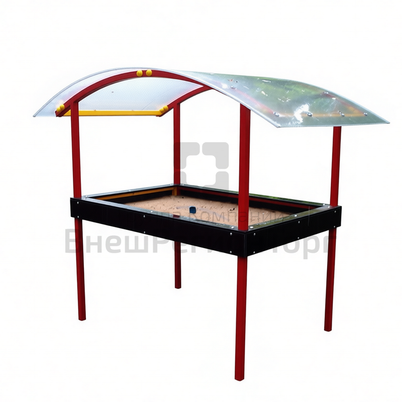 Стальная рама с полимерно-порошковой окраской, тело песочницы - влагостойкая ламинированная фанера, крыша - сотовый поликарбонат 6 мм.