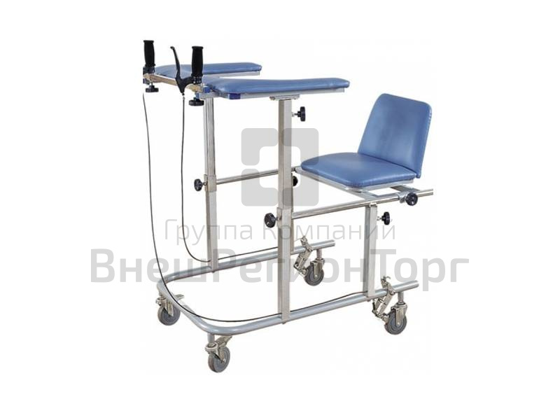 Конструкция оснащена колесиками с активными и пассивными тормозами, а также предусматривает возможность изменения высоты столика и кресла.