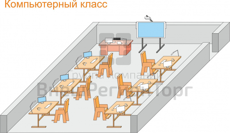 Количество рабочих мест учеников, детских адаптированных кресел или обычных стульев зависит от потребностей заказчика и площади компьютерного класса.