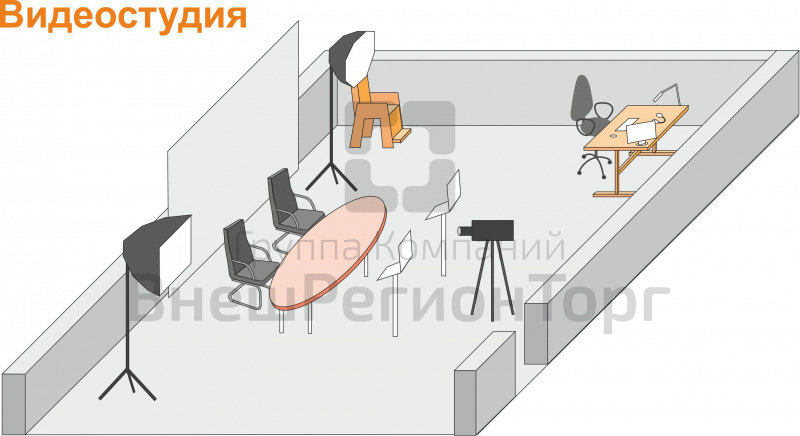 Состав видео- и фотостудии может быть любой комплектации по желанию заказчика с большим или меньшим количеством составляющих.