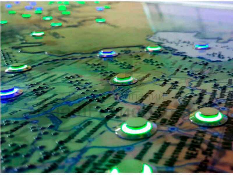 Карта России с наглядно-рельефным изображением и кнопками с подсветкой. Названия всех объектов написаны буквами и продублированы системой Брайля. При нажатии на кнопку воспроизводится подробная информация об объекте: точное расположение и особенности.