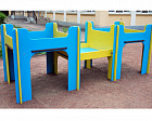 Двойная песочница обладает двумя песочниками, между которых расположен столик, высокие ножки делают возможным использование песочницы для инвалидов-колясочников.