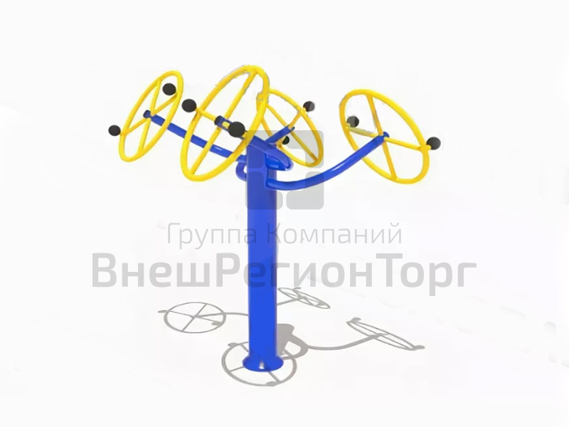 Тренажер для выполнения вращательных движений по кругу предназначен для тренировки и укрепления мышц и суставов рук и плечевого пояса, увеличивает эластичность соединительных тканей. Тренажер рассчитан на четырех человек. Несущая стойка тренажера выполнена из металлической трубы сечением Ø 110 мм, бетонируется в землю на 0,6м., сверху стойка закрыта пластиковой заглушкой