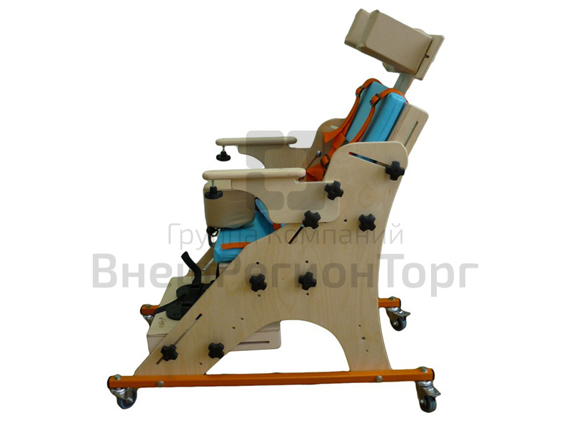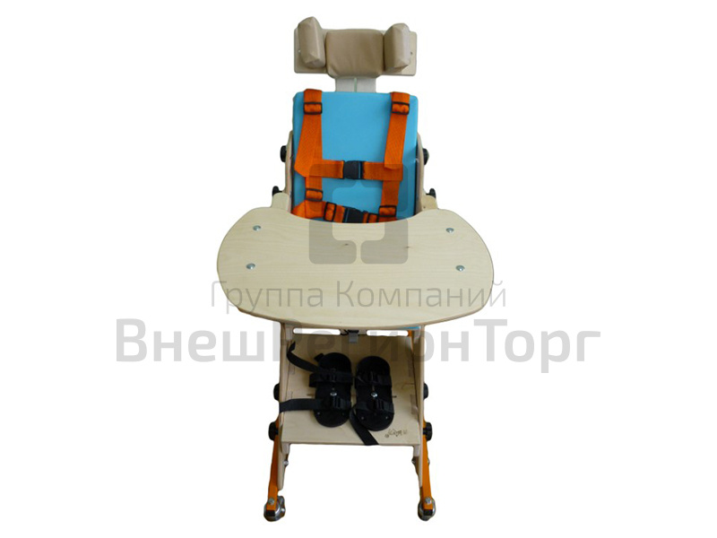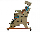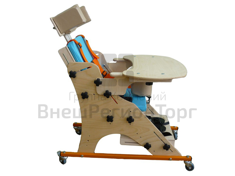 Опора для сидения предназначена для реабилитационных мероприятий с детьми с ограниченными возможностями, с патологиями различной степени тяжести, в том числе ДЦП. Представляет собой регулируемое ортопедическое кресло на металлической колесной основе. Комплектуется съемным столиком, укрепляемым на подлокотники и съемным регулируемым подголовником.