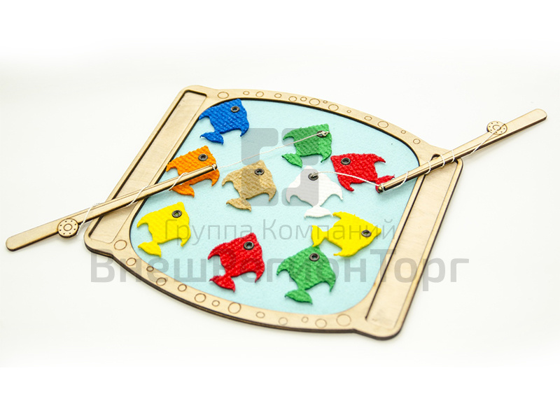 В набор входит: игровое поле, 10 разноцветных рыбок, 2 удочки, инструкция.