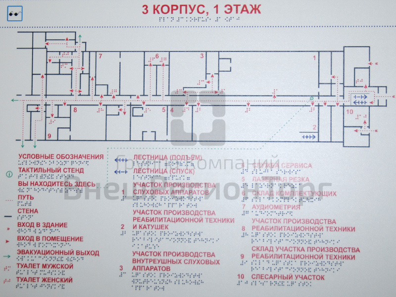 Рельефный план помещения или территории. Сочетает в себе плоско-выпуклые элементы схемы и путей движения и надписи, нанесенные рельефным способом и дублированные азбукой Брайля. Позволяет людям с нарушенным зрением самостоятельно ориентироваться в пространстве.