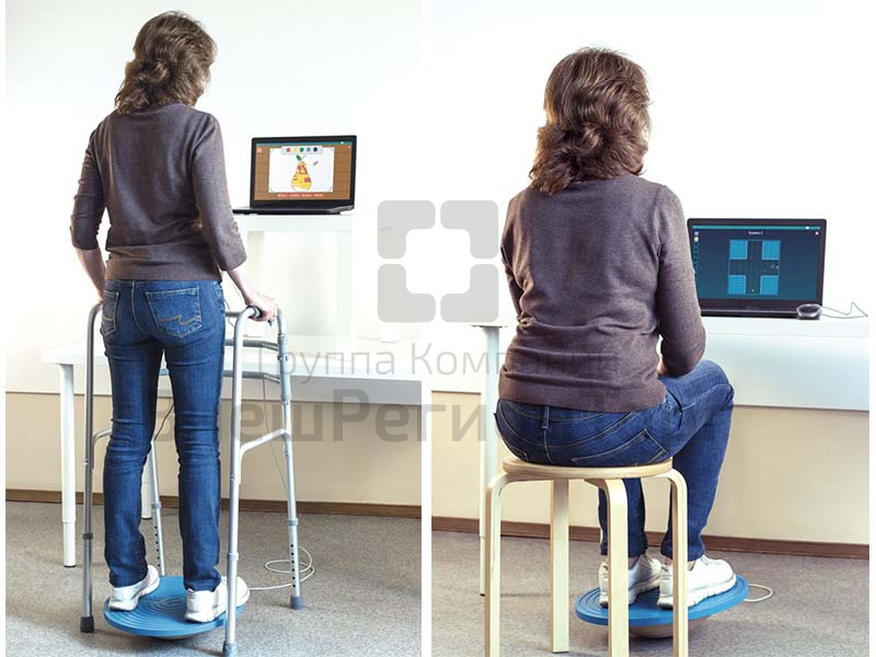 Комплекс состоит: из программного обеспечения, методического практикума и двух устройств (модулей), которые регистрируют изменения положения тела и передают сигнал в компьютер: балансирующая платформа-подушка и напольная балансирующая