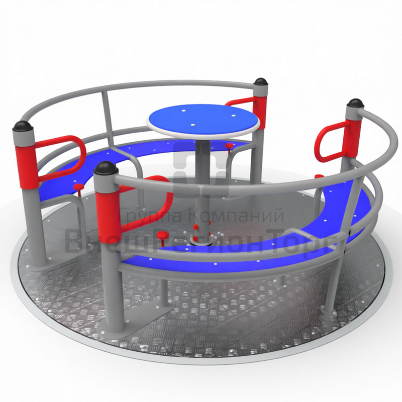 Материал: основа-каркас - нержавеющая сталь, дно карусели - профилированный алюминиевый лист с засечками противоскольжения, сидения - влагостойкая ламинированная фанера. Узлы вращения снабжены подшипниками. Не требует покрытия.