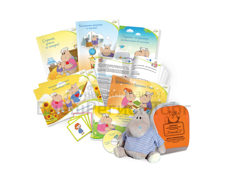 Главный герой сюжетной линии всех пособий «Комплекта реабилитационных материалов «Тоша&Co» – мягкая игрушка «Бегемотик Тоша» – верный друг и помощник ребенка на занятиях с педагогами и родителями.