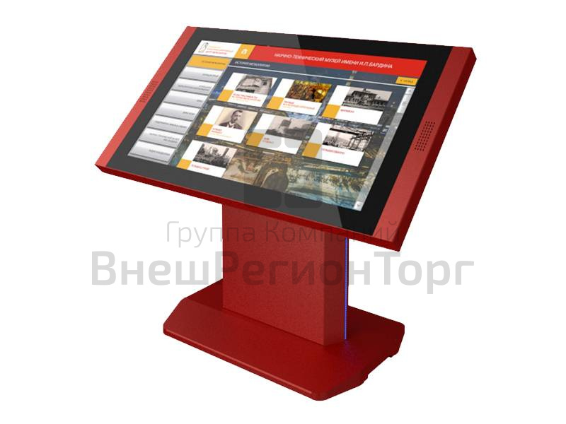 Сенсорный стол имеет броский внешний вид и элегантный дизайн. Оборудован высококачественным FULL HD экраном (43 дюйма / 106,68 см), декорирован светодиодной подсветкой. Корпус сенсорного стола изготовлен из стали 1,5 мм, а экран монитора находится под защитой толстого закалённого стекла. Экран может менять свое положение, таким образом превращая интерактивный стол в демонстрационный стенд.