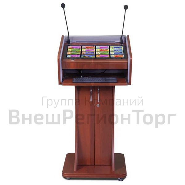 Инженеры предусмотрели удобный интерфейс для выступающего на базе ОС Windows 10. Экран имеет сенсорную панель, но при необходимости вы всегда можете воспользоваться стандартными клавиатурой и мышью. Корпус трибуны мы выполнили из надежного материала – плит ЛДСП, цвет которых вы выбираете самостоятельно.