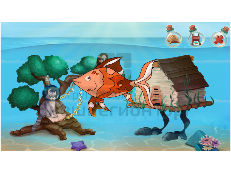 - Интерактивное морское дно, в котором присутствуют анимационные герои сказок А.С.Пушкина – русалка, избушка на курьих ножках, ученый кот, богатыри. Анимационные герои двигаются и имитируют взаимодействие друг с другом.