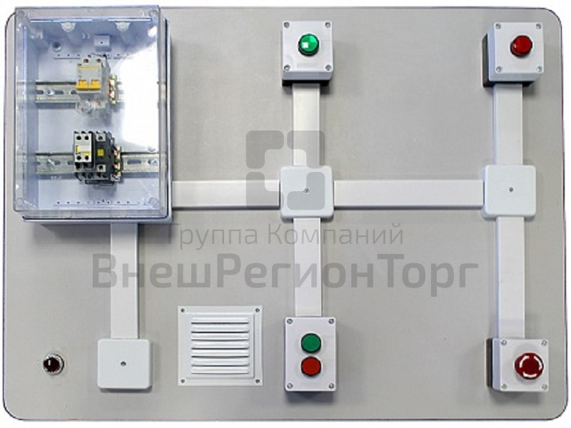 Комплект учебно-лабораторного оборудования "Пуск двигателя". На стенде сымитирован пульт управления электродвигателем со схемой прямого пуска. На рабочем поле стенда установлены кнопки пуска и остановки, лампы индикации работы, кнопка аварийной остановки и электрощит с магнитным пускателем и автоматами защиты электроцепей.