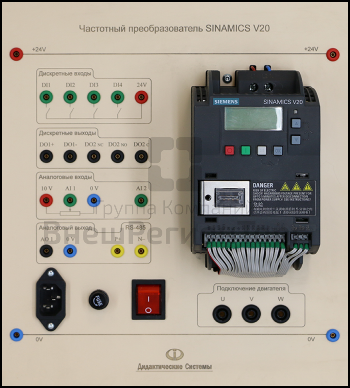 - Набор панелей "Управление асинхронным двигателем" : Панель на базе ПЛК Simatic S7-1200, Панель с частотным преобразователем SINAMICS V20, Асинхронный трехфазный двигатель