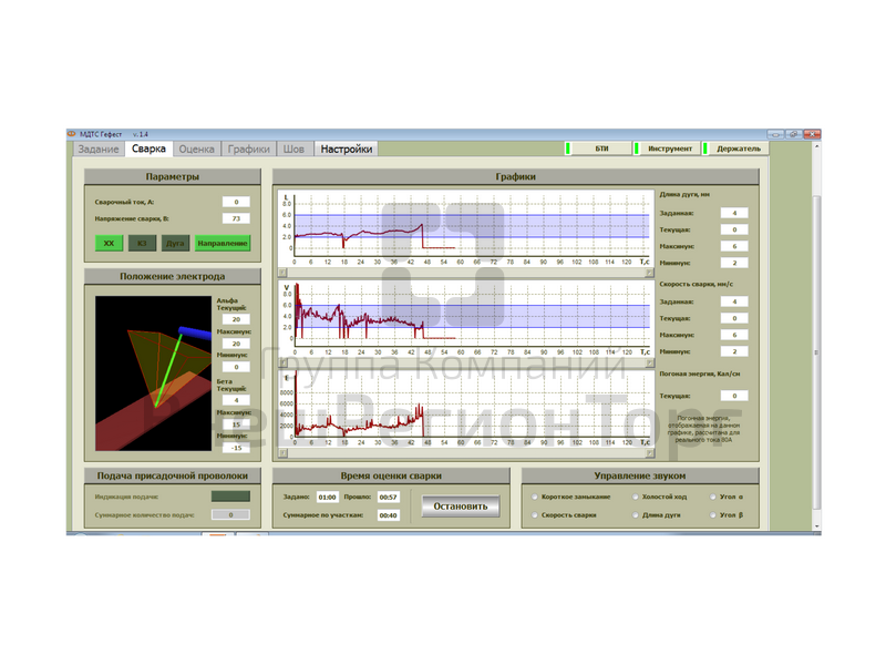 Скорость сварки, мм/с в пределах 2…12. Длина дугового промежутка, в пределах, мм 0,5…6. Углы наклона электрода «вдоль и поперек шва», ° ± 85. Напряжение дуги, В в пределах 20 — 45.Длительность сеанса обучения, мин 1−10.