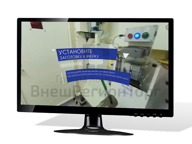 Программа реализована как интерактивный видеоролик 360. В любой момент можно вращать головой видеть окружающую обстановку. Реальный человек – рабочий, оператор перемещается по цеху и закладывает детали в ячейку сварного робота. Программа обучает пользователя расположению кнопок аварийной остановки, показывает, где лежат заготовки, как их крепить в ячейке, закреплять зажимы, какие крутить рычаги. На каждый важный шаг используется всплывающая подсказка, акцентирующая внимание обучаемого. Подсказки и комментарии дублируются диктором. Отдельными роликами сделан экзамен. Доступны версии на разных языках.