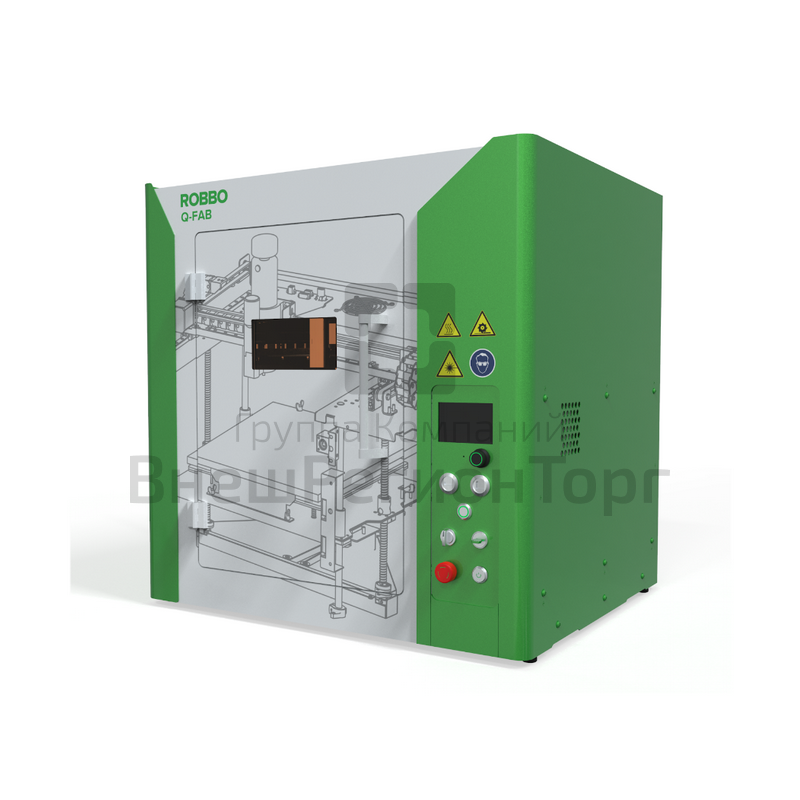 Многофункциональная универсальная платформа «РОББО Q-Fab» не только осуществляет печать термопластиком, в ней также предусмотрены 3D функции фрезерования, лазерной гравировки и резки. Для этого устройство оснащено двумя экструдерами для печати ABS и PLA пластиками, фрезером с воздушным охлаждением и лазерным модулем. Такой 3D принтер имеет подогреваемый рабочий стол и закрытую термокамеру.