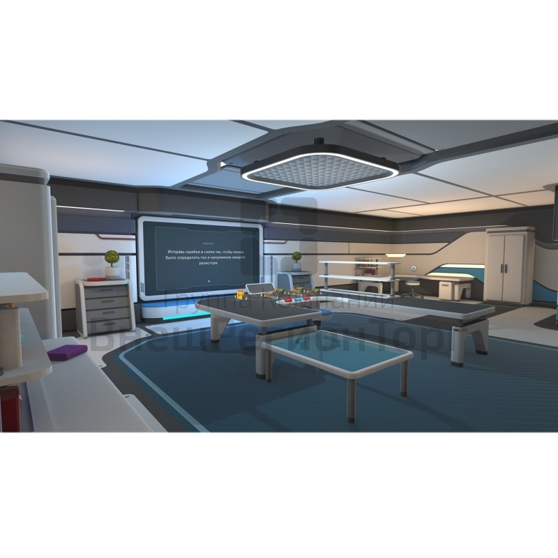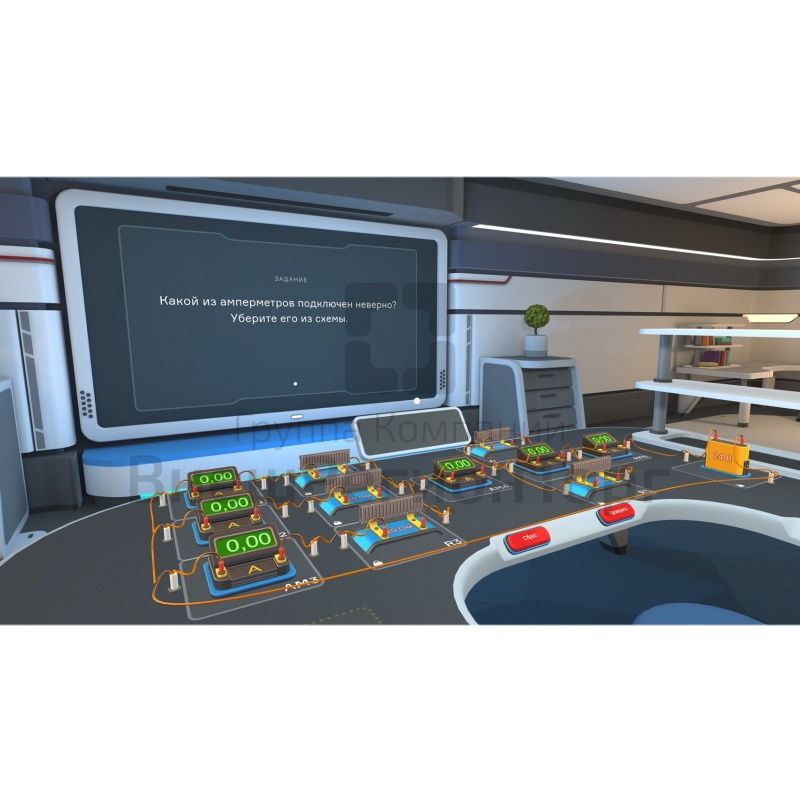 - Практика. С помощью пульта управления VR-устройства ученики решают практические задания на дополнение или корректировку электрических цепей с возможностью получить подсказку