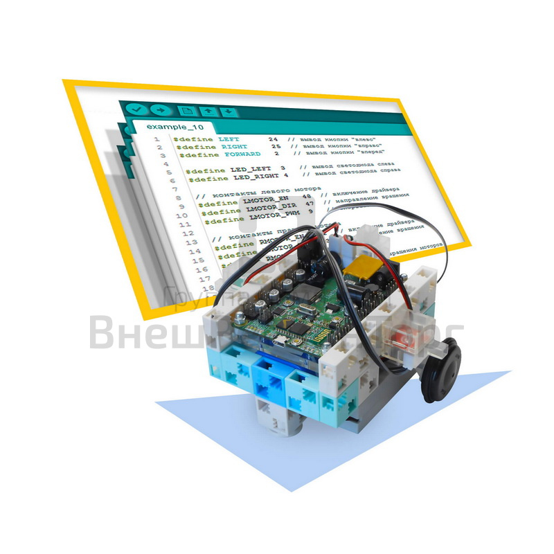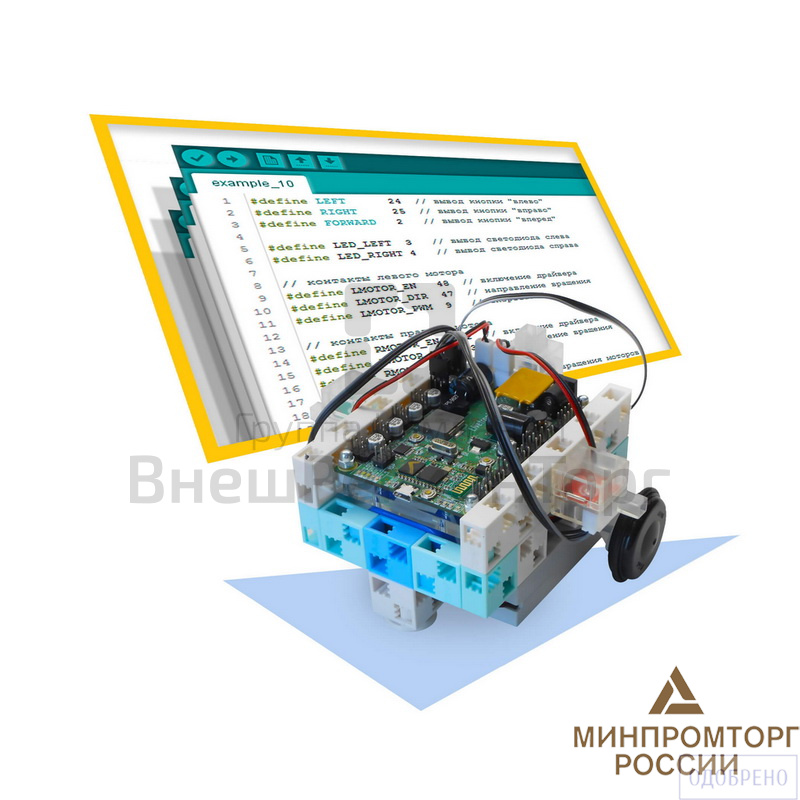Базовый робототехнический набор для конструирования, изучения электроники и микропроцессоров и информационных систем и устройств (электронные устройства (датчики, моторы, сервормоторы). Набор предназначен для обучения детей среднего и старшего возраста приемам программирования робототехнических устройств на языке С (Си).