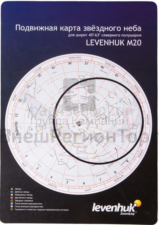 В центре звездной карты – Полюс мира, а рядом с ним – Полярная звезда. На звездную карту нанесены изображения всех известных звезд до 3-й звездной величины. Размеры кружка соответствуют яркости объекта. Самые яркие звезды обозначены собственными именами. Пластиковое покрытие, которое обеспечивает долговечность карте и не позволяет заламываться углам.