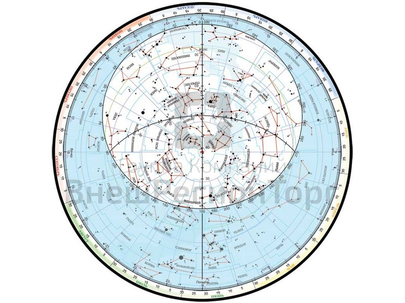 Карта состоит из двух кругов, которые скреплены между собой в центре. На основном нижнем круге обозначены звезды до 5-й звездной величины.