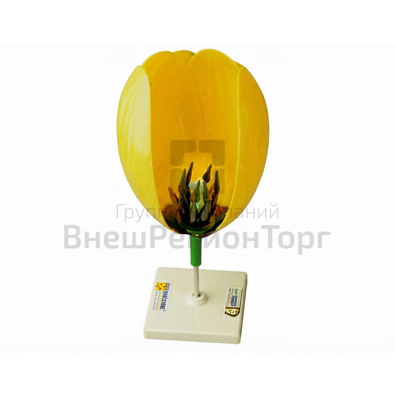 Модель демонстрирует строение цветка тюльпана. Модель разборная, снабжена пластмассовой подставкой. Детали модели изготовлены из пластмассы и окрашены в естественные цвета.