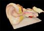 На модели цветом выделены следующие детали строения уха человека: 1. Ушная раковина. 2. Наружный слуховой проход. 3. Барабанная перепонка. 4. Молоточек. 5. Наковальня. 6. Стремя. 7. Слуховая труба. 8. Улитка.