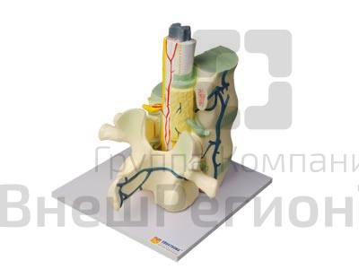 На модели цветом выделены следующие детали строения позвоночного столба человека: тело позвонка, межпозвоночные диски, отростки позвонка, спинномозговой канал, спинной мозг, нервные пучки, кровеносные сосуды.
