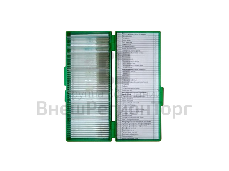 В комплекте более 40 готовых микропрепаратов с образцами тканей растений, животных и человека.