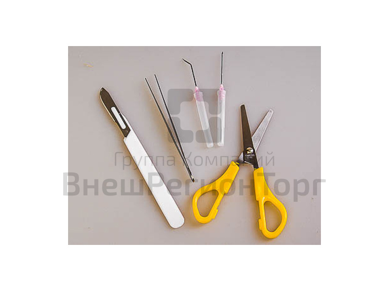 Комплектность: скальпель хирургический – 1 шт., ножницы – 1 шт., пинцет – 1 шт., игла препаровальная прямая – 1 шт., игла препаровальная угловая – 1 шт.