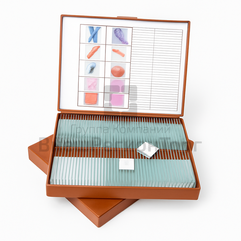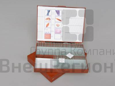 Комплектность: конъюгация у водоросли - 15 шт., митоз в корешке лука - 15 шт., дрозофила взрослая - 5 шт., личинка дрозофилы - 5 шт., куколка дрозофилы - 5 шт., дробление яйцеклетки лягушки - 15 шт., препарат хромосом - 5 шт., бактерии - 15 шт., плазмодесмы - 5 шт., микросомы - 15 шт. Всего: 100 шт.