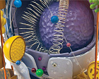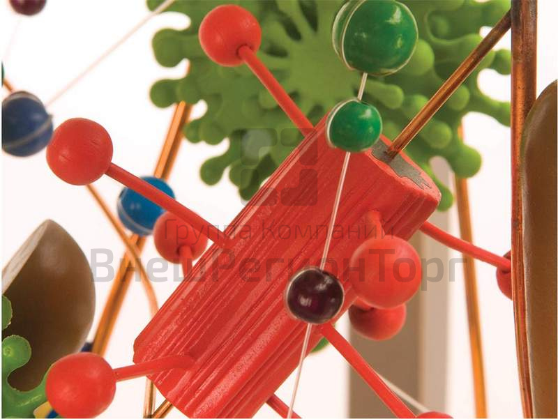 На модели представлена недифференцированная человеческая клетка, увеличенная в 40000 раз. С ее помощью можно изучать строение самой мелкой ячейки организма, способной к самостоятельному существованию, как под электронным микроскопом. На модели показаны клеточные органеллы, отвечающие за основные жизненные функции. Их расположение дает статическое представление динамического равновесия в клетке. Ядро, несколько митохондрий и лизосомы показаны в разрезе, так, что можно видеть их внутреннее строение. Модель закреплена на штативах.