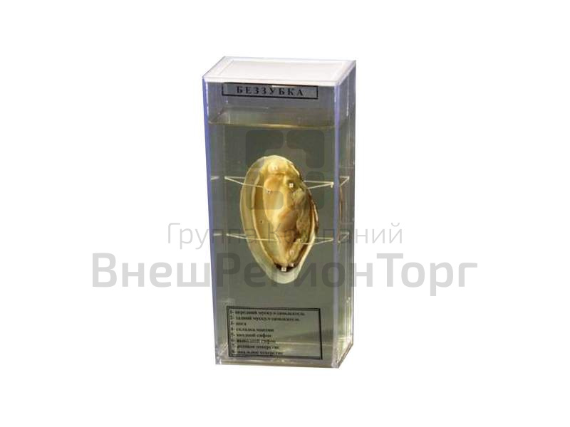 Препарат закреплен на стеклянной пластине, которая помещена в консервирующую жидкость и установлена в пазы прозрачного пластмассового сосуда и пластмассовой крышки. Сосуд герметично закрыт. На препарате представлен пресноводный моллюск - беззубка (двустворчатый моллюск) с одной удаленной створкой раковины, что дает возможность рассмотреть органы, которые пронумерованы:1. Передний мускул; 2. Задний мускул; 3. Нога; 4. Складка мантии; 5. Вводной сифон; 6. Выводной сифон; 7. Ротовое отверстие; 8. Анальное отверстие.